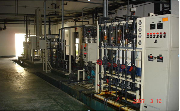 3、原水→原水加壓泵→多介質過濾器→活性炭過濾器→軟水器→精密過濾器→一級反滲透機→中間水箱→中間水泵→EDI系統(tǒng)→純化水箱→純水泵→紫外線殺菌器→微孔過濾器→用水點